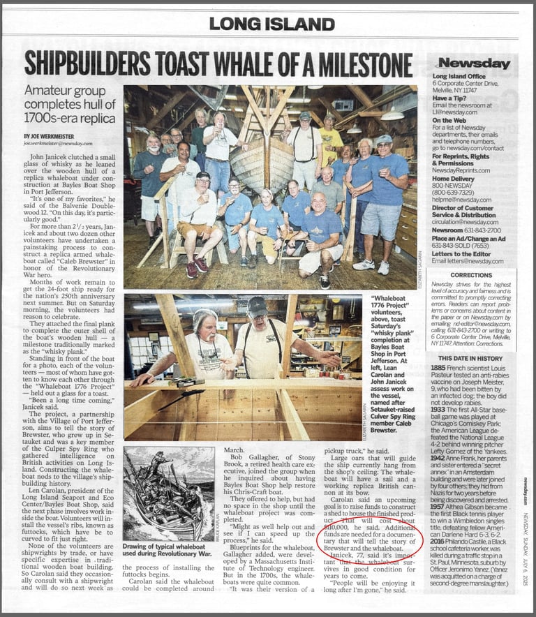 Our local Long Island Newsday reporters covered the inspiring project of volunteers building a Revolutionary War Whaleboat are playing a critical role in highlighting the dedication and commitment of these individuals.